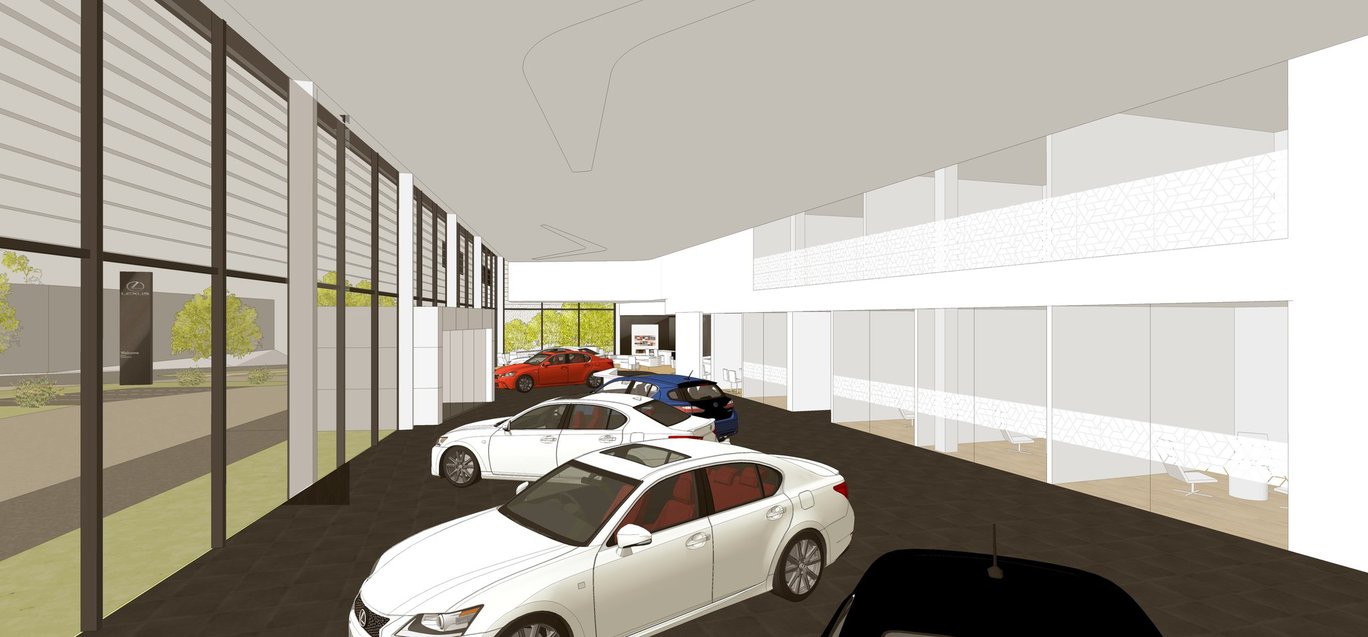 Hlavní vstup do prodejní části se nachází uprostřed prosklené západní fasády. Vstupuje se do rozlehlého showroomu. Stavba uvažuje s ocelovou skeletovou konstrukcí založenou na železobetonových patkách.