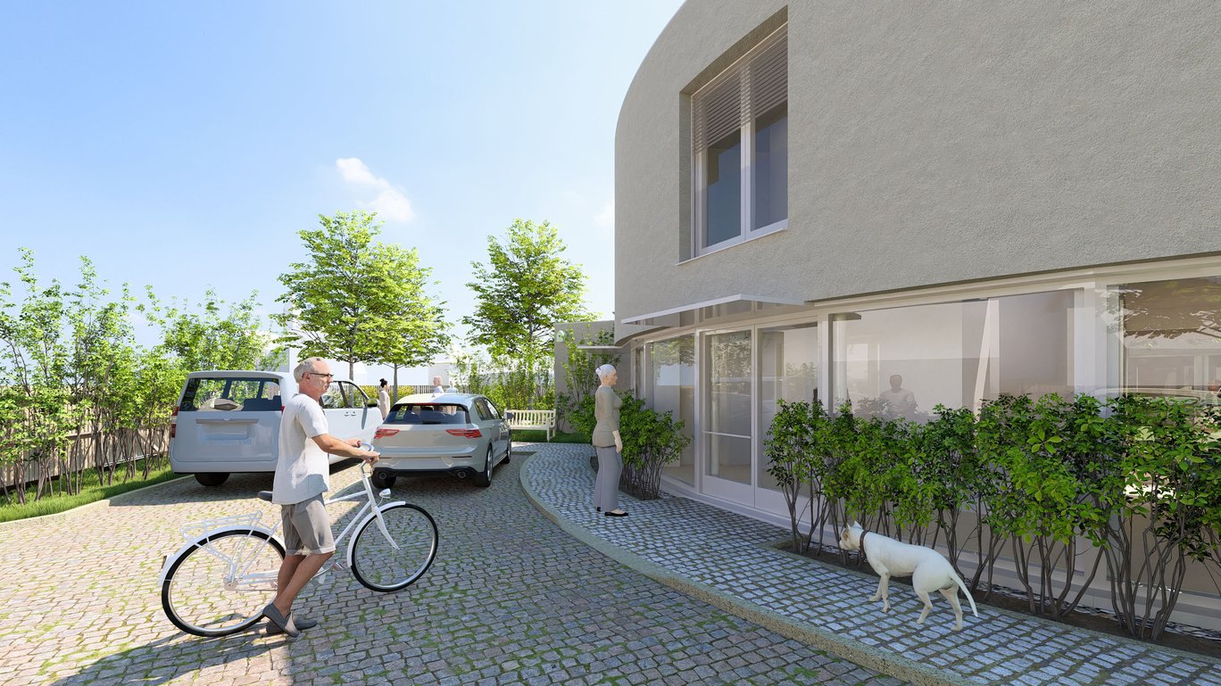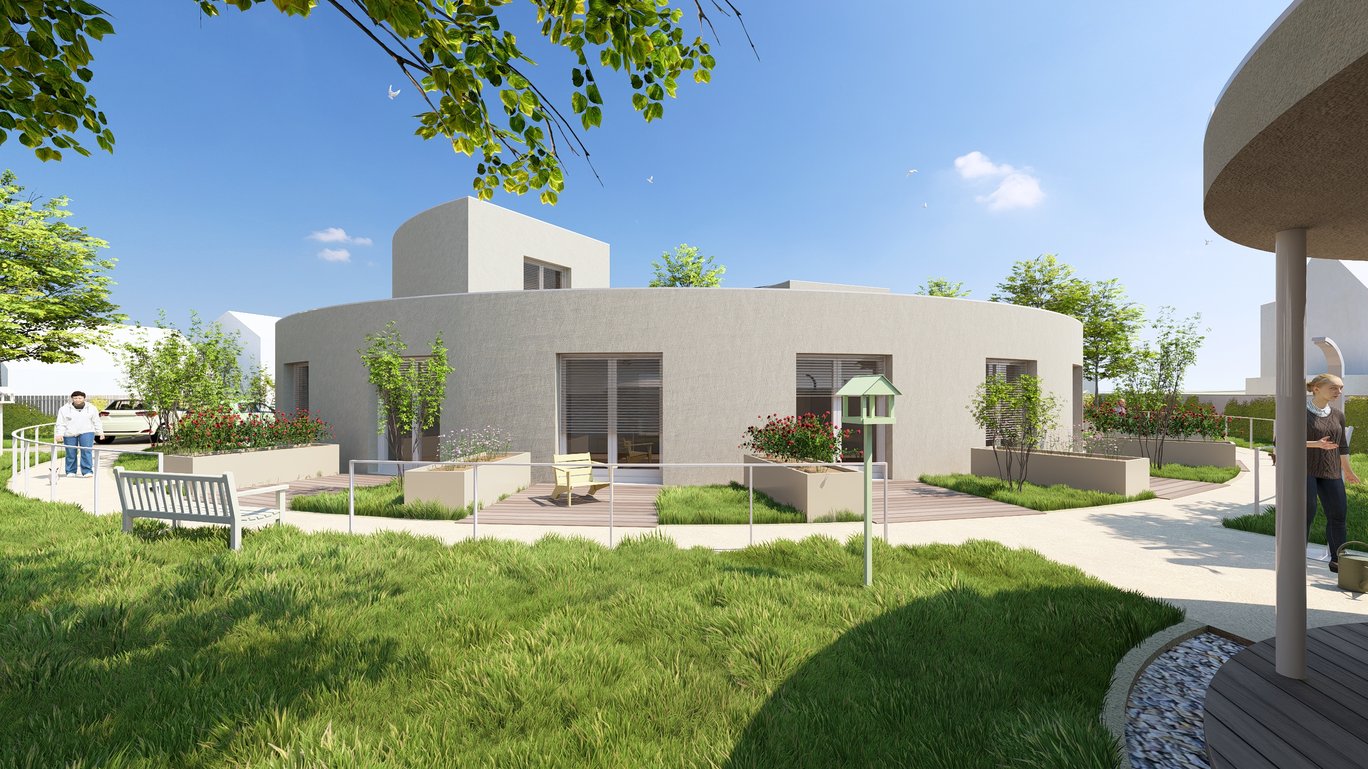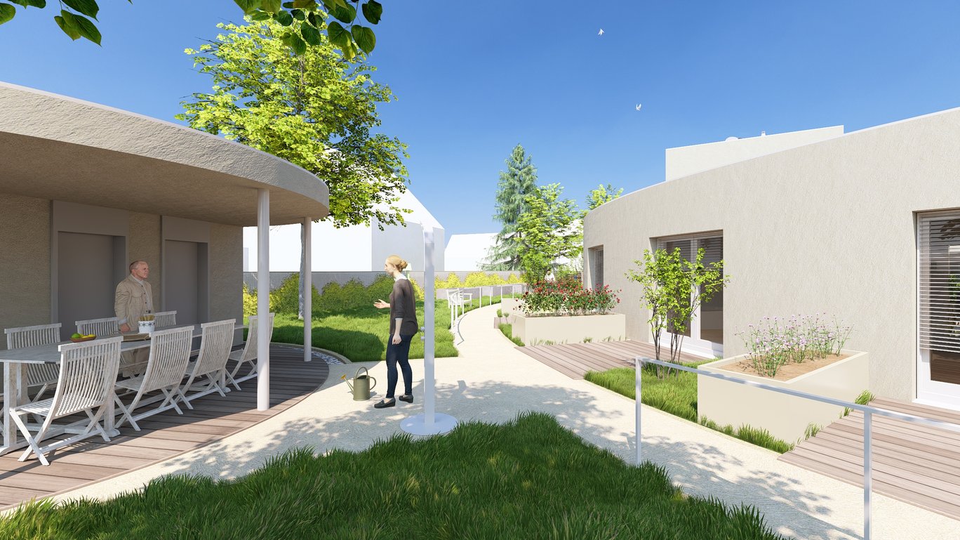 Kolem centrálně umístěné stavby tak vznikne produkční zahrada s ovocnými stromy a zvýšenými záhony, která bude prostorem pro aktivizaci zde žijících obyvatel. Na severní straně pozemku dle stávající situace je zachován vstup a vjezd. V této části pozemku vznikne zpevněná plocha pro parkování a zásobování.