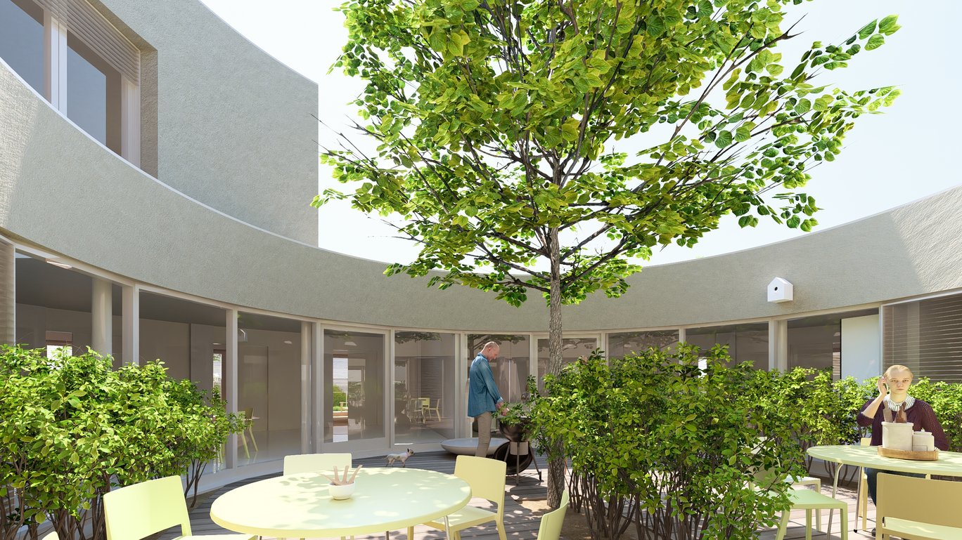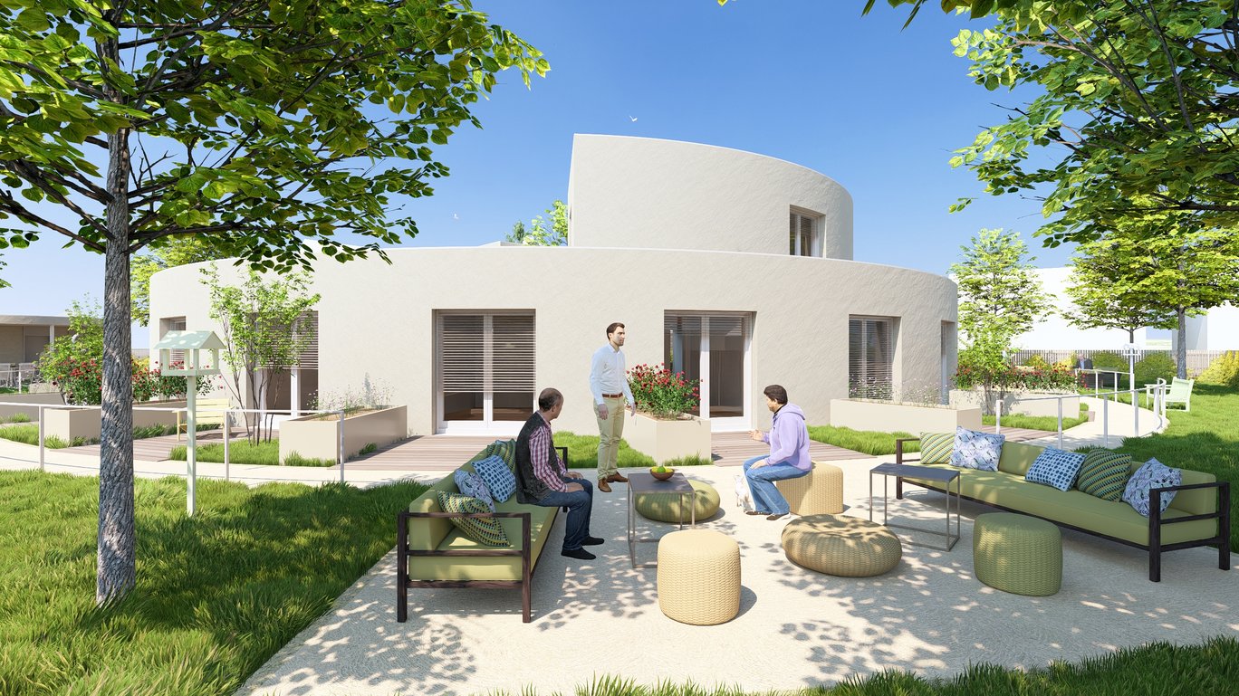 Na osluněné strany jsou po obvodě stavby situovány pokoje navazující na soukromé terasy klientů se zvýšenými záhony. Pro venkovní pobyt obyvatel slouží také atrium, dvě venkovní plochy pod korunami stromů a zahradní altán, který díky zastřešení umožňuje pobyt i za deště.