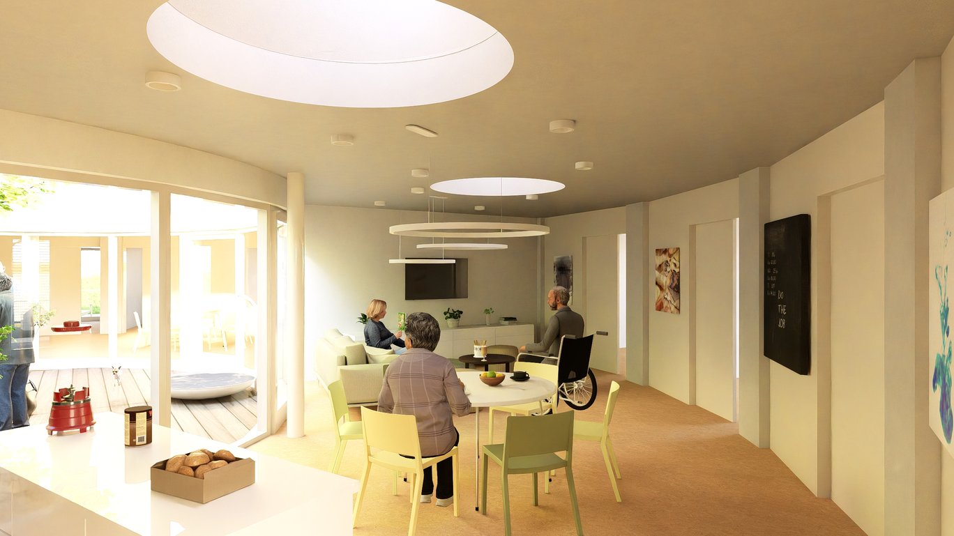 Dům bude obsahovat dvě samostatné domácnosti pro klienty, zázemí pro pracovníky v sociálních službách, zdravotní sestry a technické zázemí. Ze severní strany jsou navrženy tři samostatné vstupy – pro domácnost A, domácnost B a pracovníky poskytovatele.