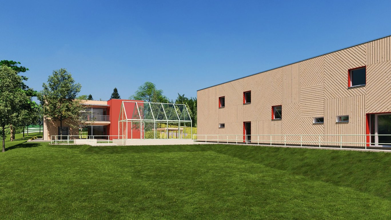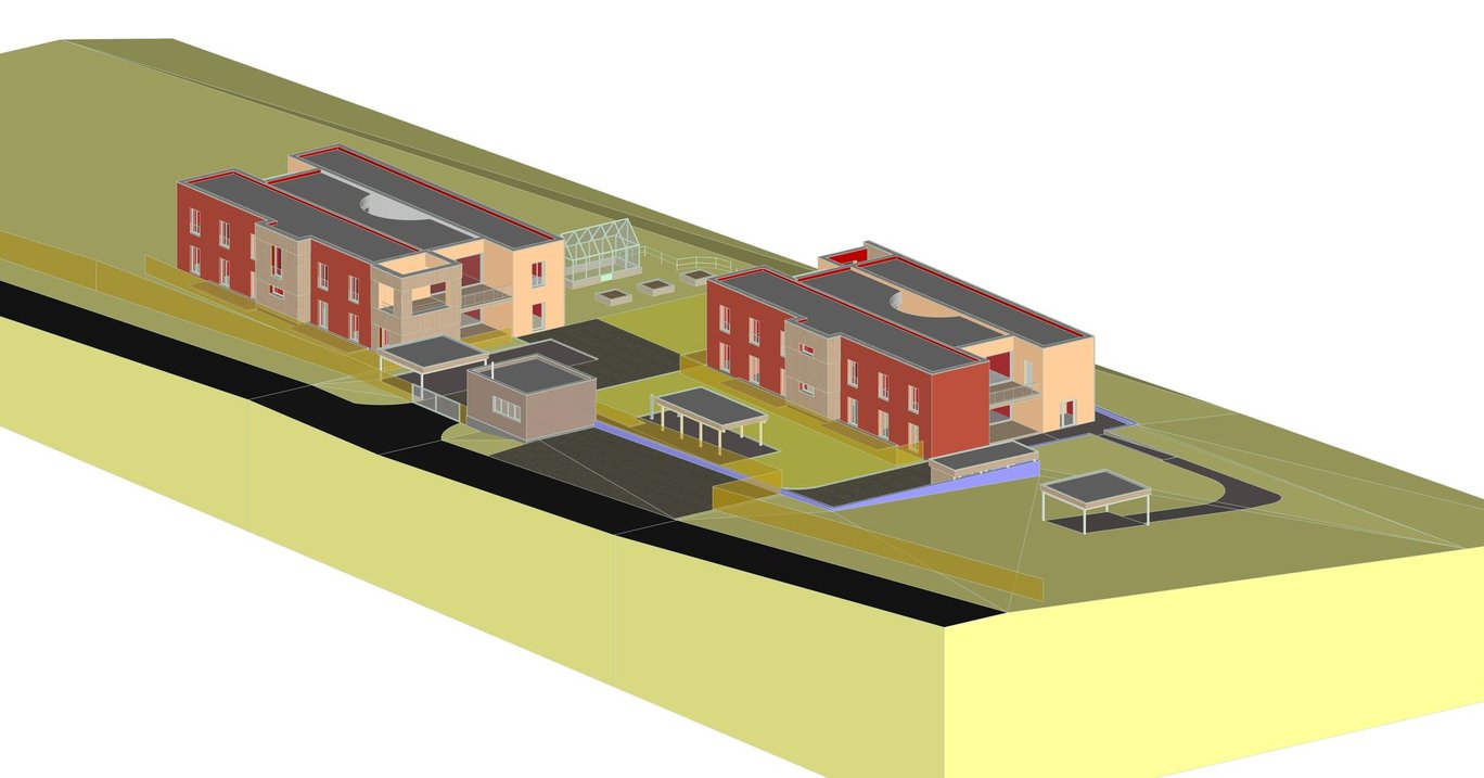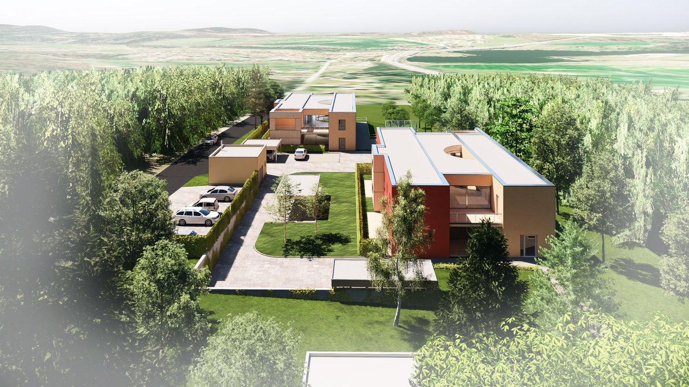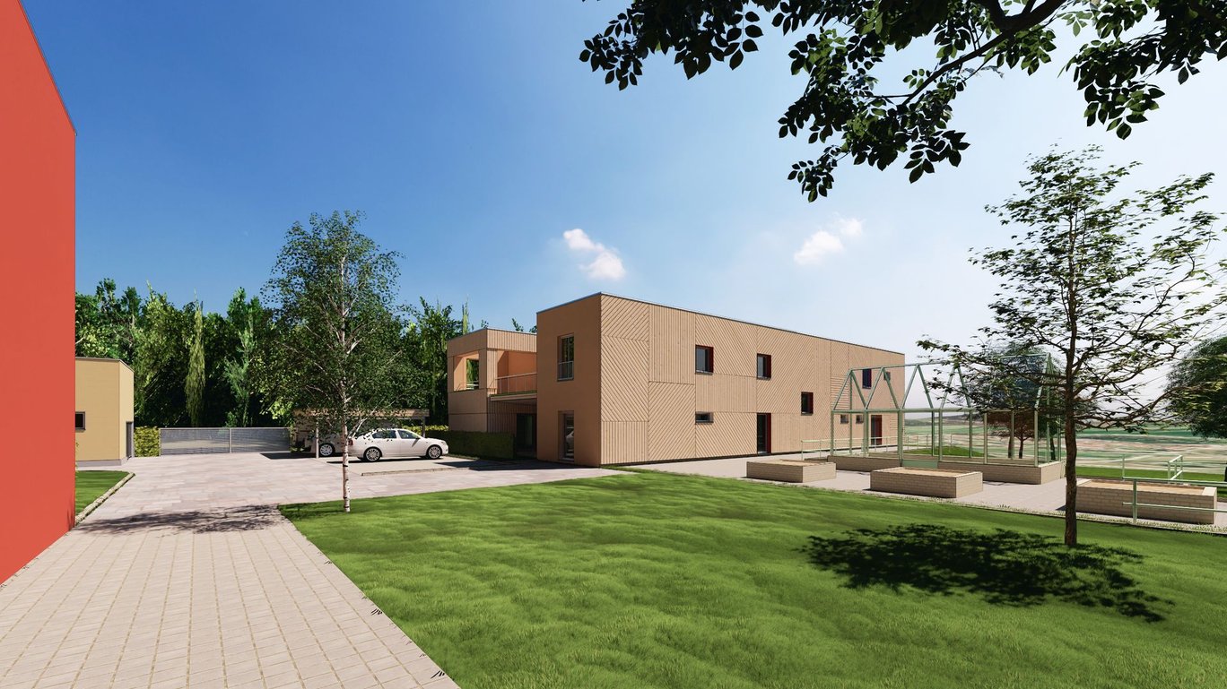 Výstavba dvou nových dvoupodlažních obytných domů komunitního charakteru pro celkem 18 klientů se zázemím pro pracovníky. Na svažitém rozměrném pozemku pro aktivizaci klientů vznikne relaxační a produkční zahrada s ovocnými stromy a zvýšenými záhony.