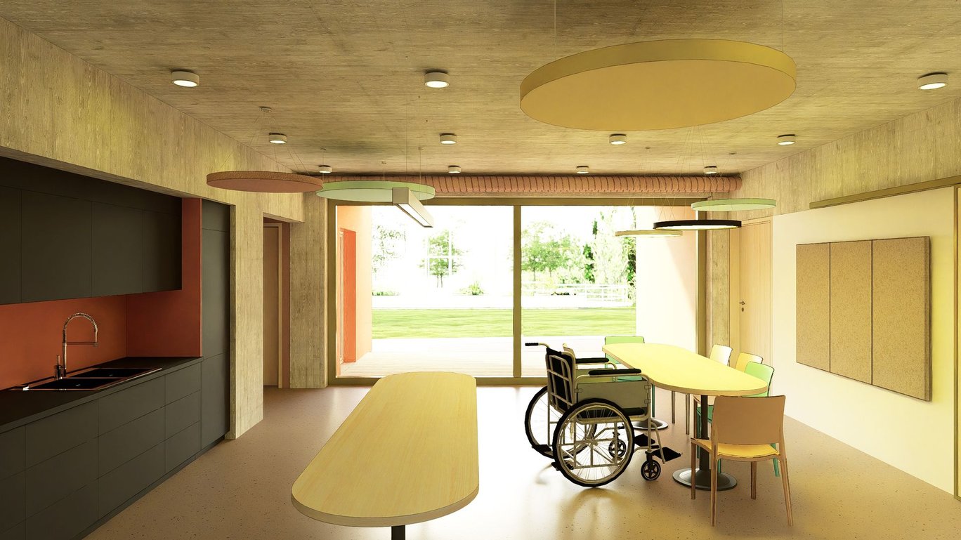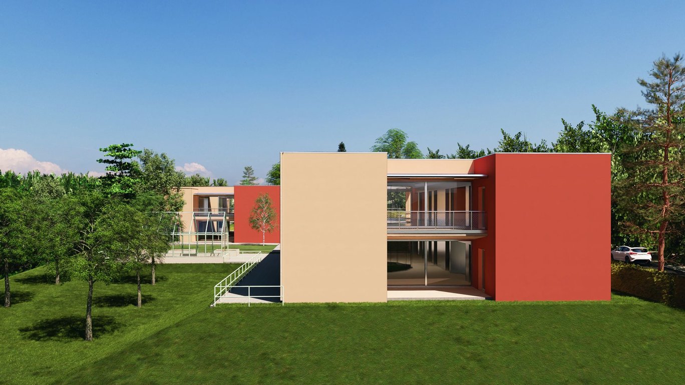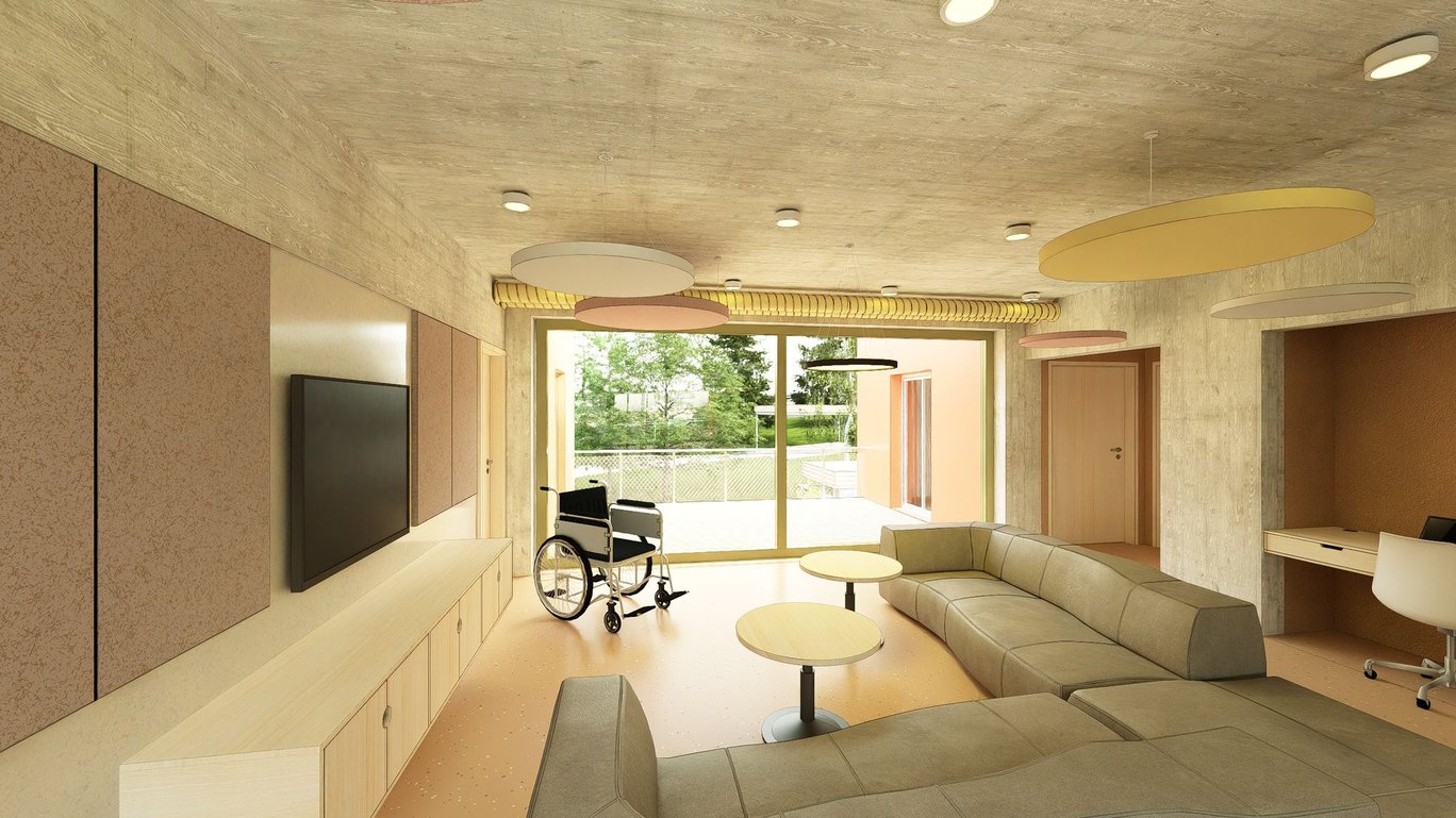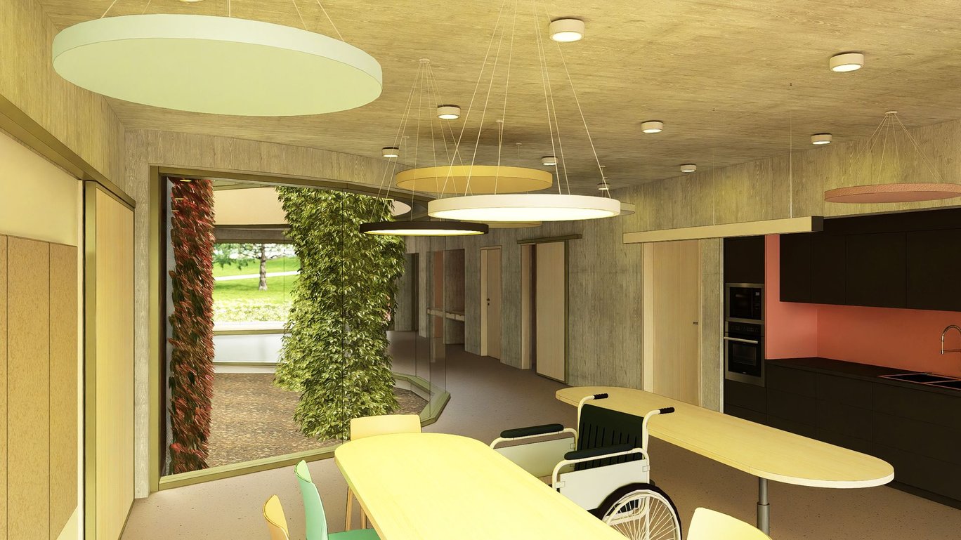 Výstavba dvou nových dvoupodlažních obytných domů komunitního charakteru pro celkem 18 klientů se zázemím pro pracovníky. Na svažitém rozměrném pozemku pro aktivizaci klientů vznikne relaxační a produkční zahrada s ovocnými stromy a zvýšenými záhony.